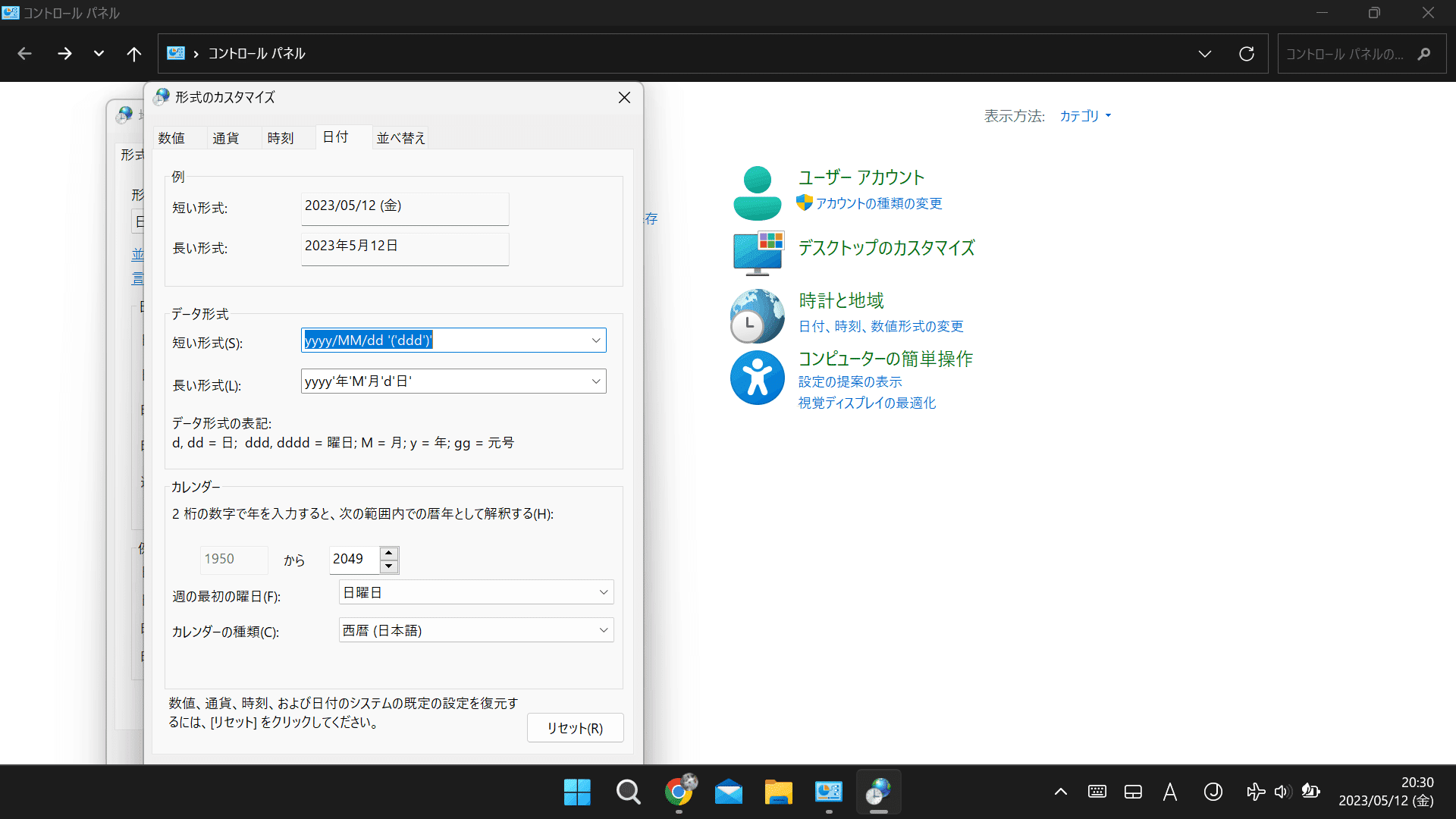 というのも、この日の前日に、あるネットの情報から、Windowsのデフォルトの日時表示を曜日付きに変えられる、ということを知り、その設定をいじっていました。