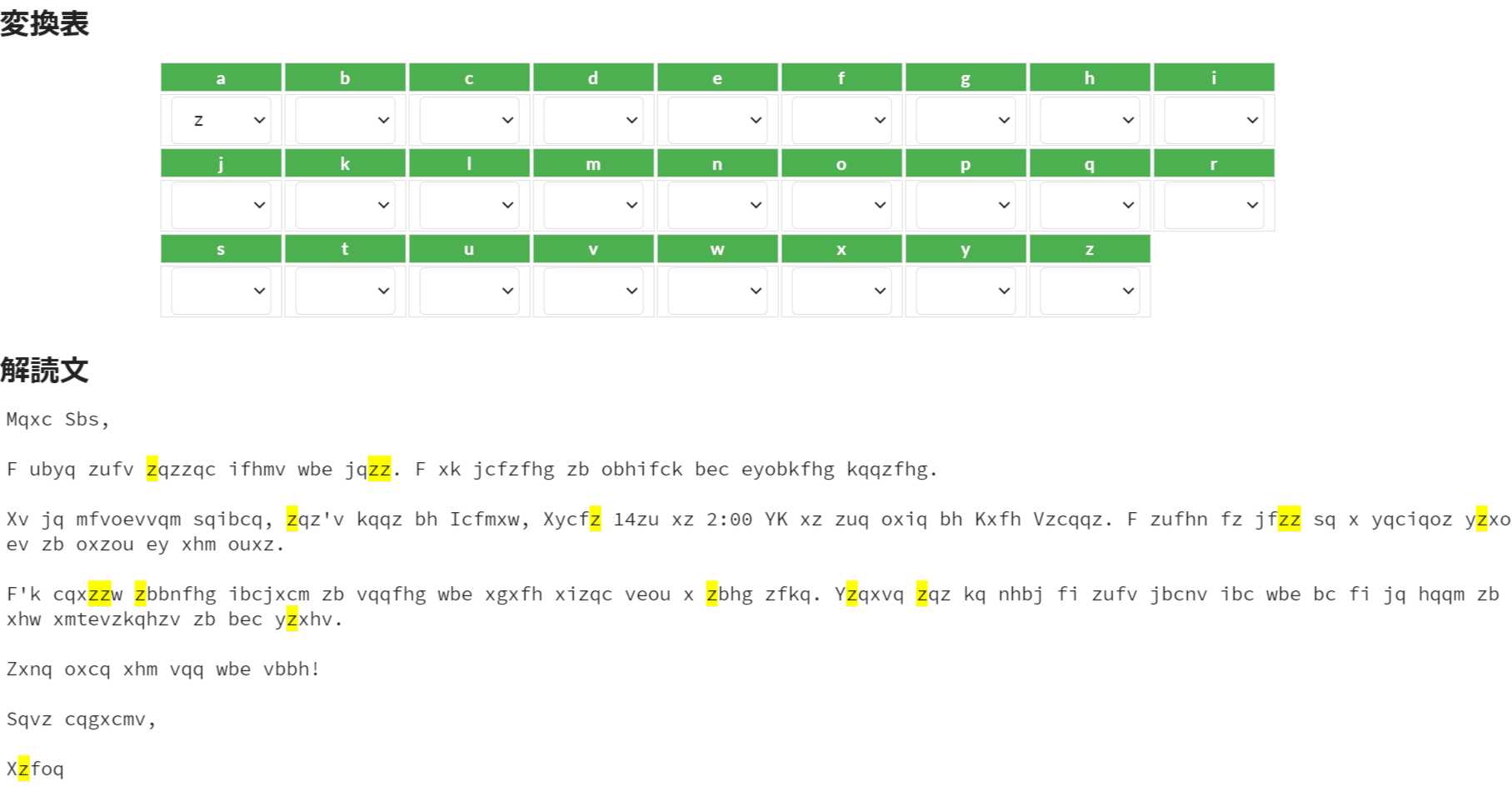 換字式暗号という暗号の解読ツールです。