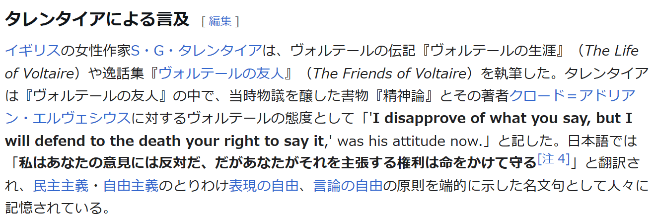 ところで、その辺りのことを考えていると、私の小学校の頃の(あまり好きではなかった、けれど利発な)友人が、一切の脈絡なくよく言っていた、「私はあなたの意見には反対だ、だがあなたがそれを主張する権利は命をかけて守る」という言葉が何故か思い出されます。